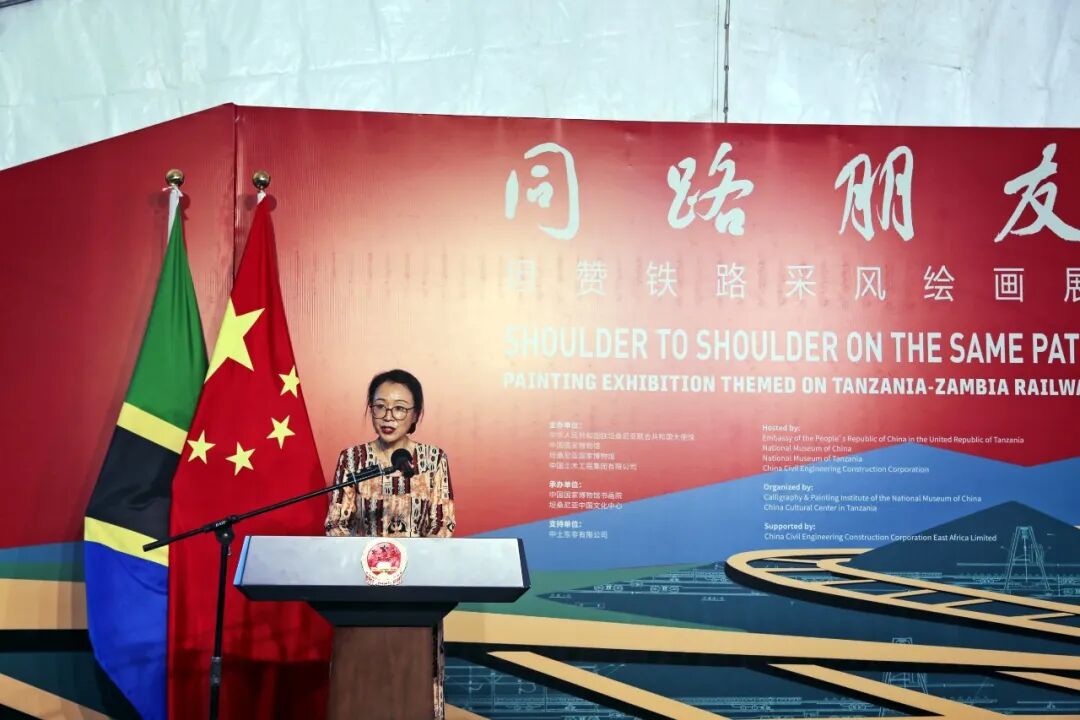 開幕式上,陳明健大使在致辭中回顧了坦贊鐵路的建設歷程,指出這條鐵路不僅是自由之路、發展之路,更是友誼之路,串聯起中坦贊三國人民的深厚情感。她強調,隨著坦贊鐵路激活項目的簽署與開工,這條跨越半個世紀的鐵路將煥發新的生機,為兩國發展注入新的動力。基賈濟部長對主辦方表示感謝,認為畫展有力傳承了坦贊鐵路精神,并期待激活項目順利推進,使鐵路繼續成為連接三國人民心靈與發展的紐帶。隨后,兩位嘉賓共同為畫展揭幕,宣布展覽正式啟動。